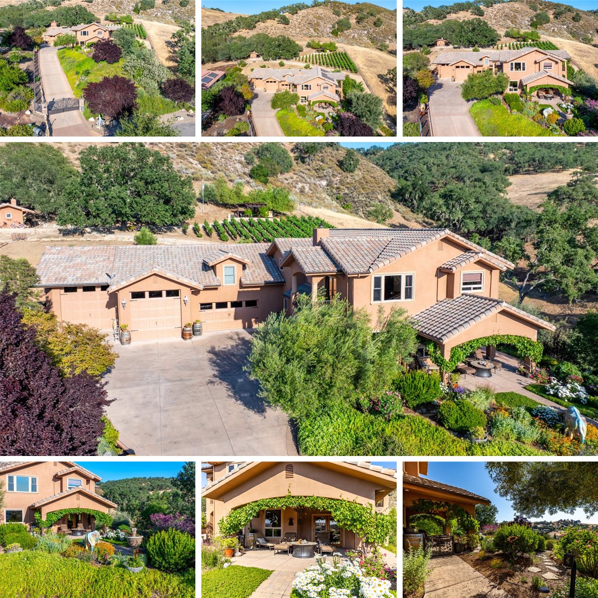 Luxury vineyard estate with extraordinary amenities in the gated community of Heritage Ranch. Set behind custom iron entry gates with stone pillars & lighting, this 3,166± sq. ft. custom-built home sits on a beautifully landscaped 1-acre parcel. It showcases exceptional craftsmanship, an attached 9-car finished garage with a fully equipped guest unit above, & breathtaking views of the private vineyard, gardens & valleys.